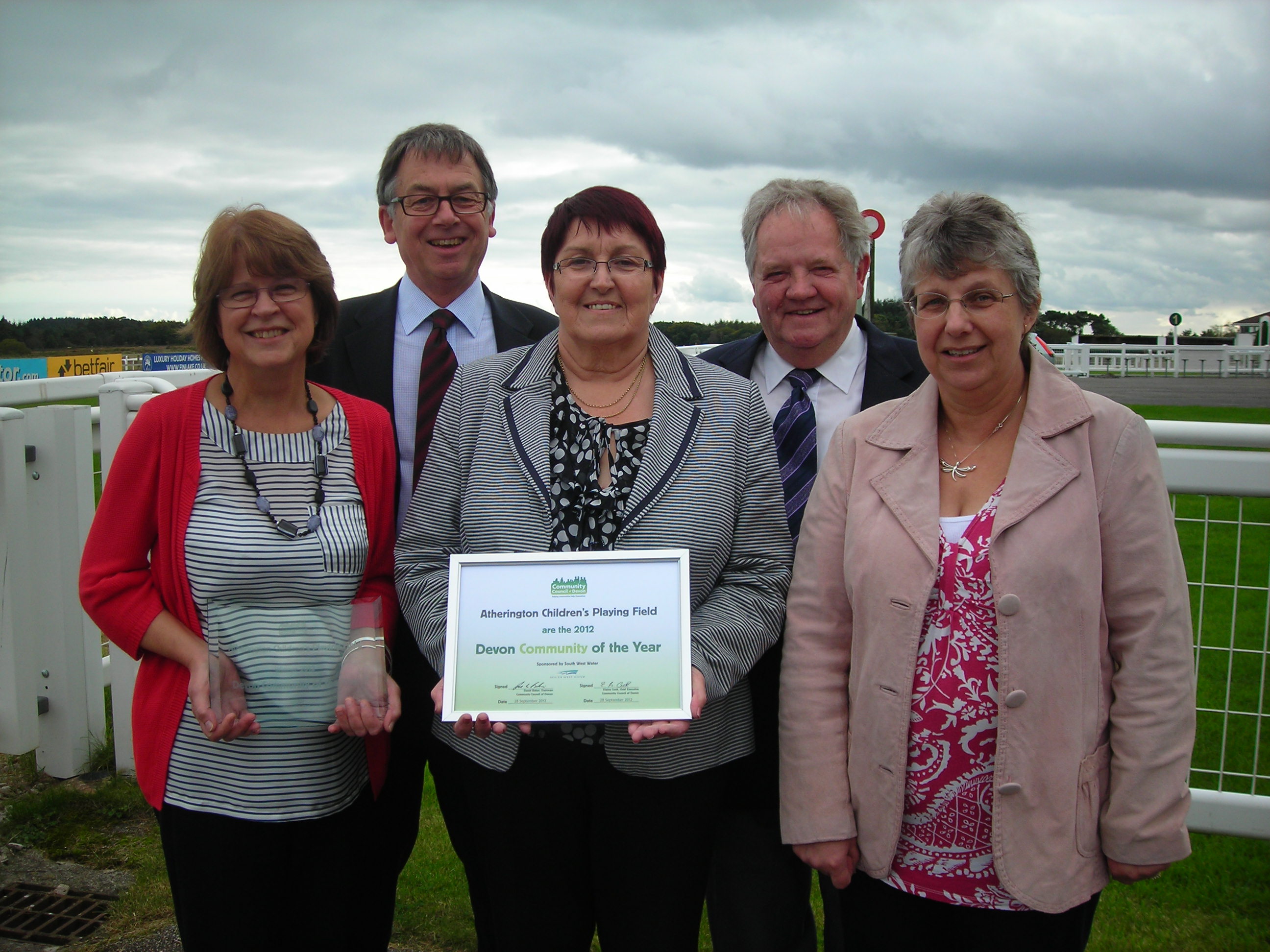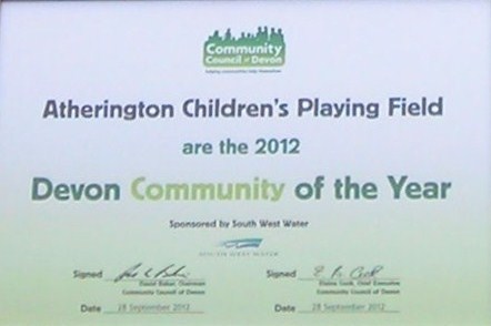 On September 28th, at Exeter Racecourse, representatives of the Childrens Playing Field Committee were presented with a cheque for £500, together with a trophy and certificate as winners of this year’s Devon Community of the Year.