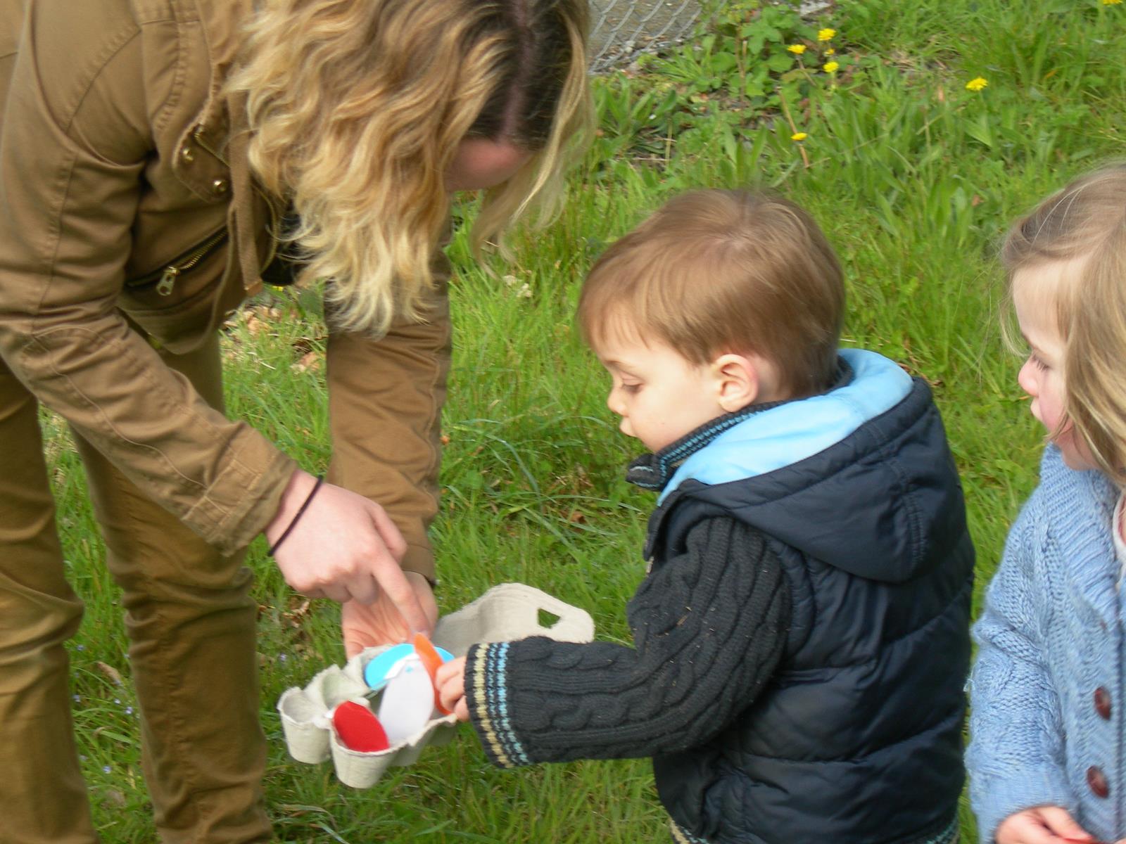 The children decorated their egg boxes and then searched the field for 6 brightly coloured eggs. On completion they were presented with a choc egg. All enjoyed the great weather!