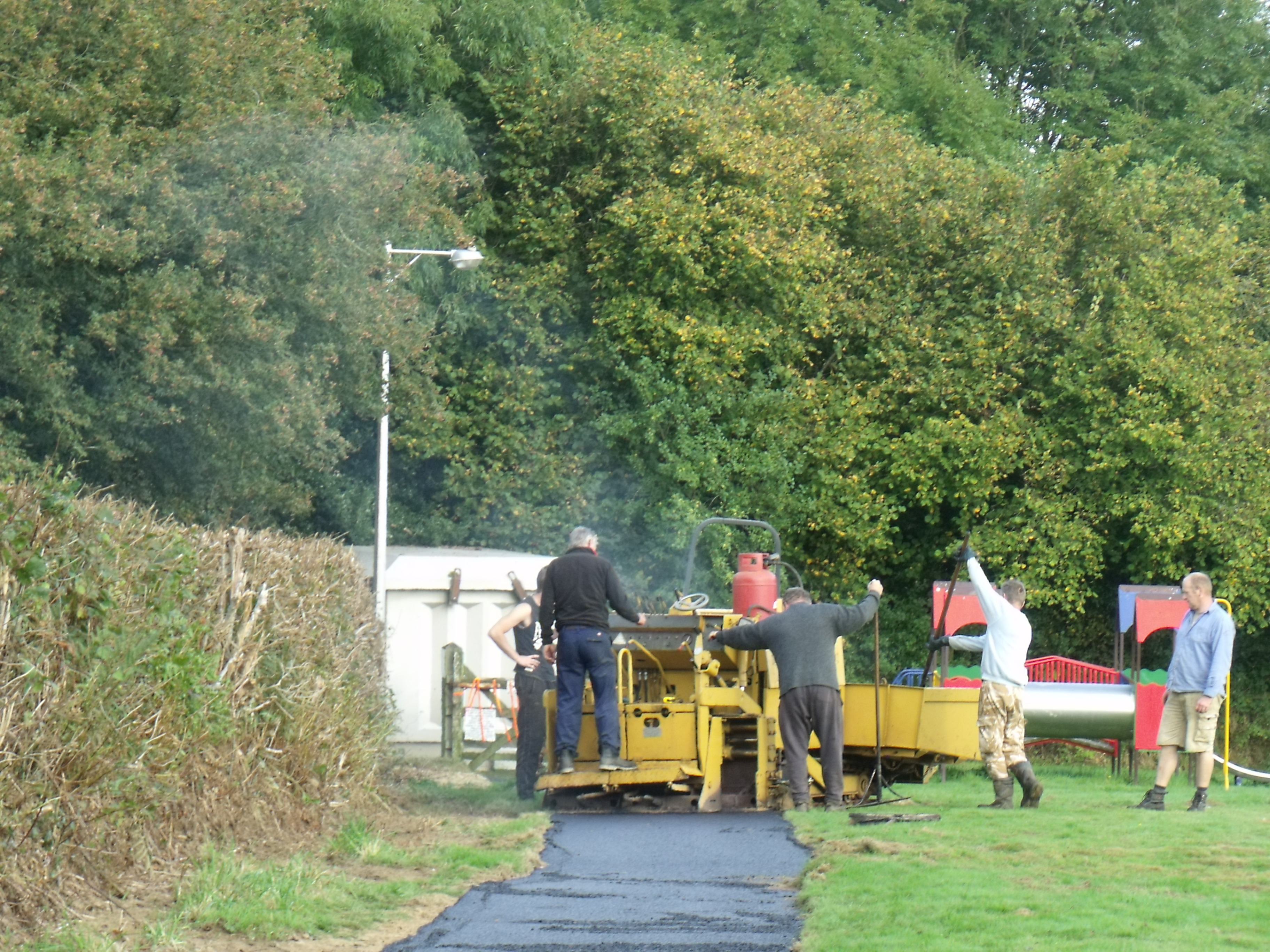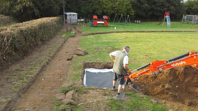 Photo shows the Cycle track that runs alongside the hedge and turns left to create a boundary between play area and football field. The lower path is added to link the cycle track to the small entrance gate. Chris Hart supervises the digging of the soak away/ drainage for car park and top of the field.